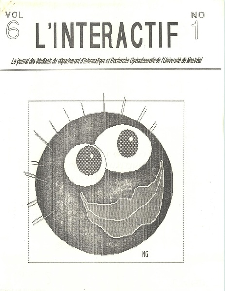 Révision datée du 7 novembre 2025 à 22:57 par MattéoDelabre (discussion | contributions) (L’Interactif, le journal des étudiants du département d’informatique et recherche opérationnelle, volume 6, numéro 1, 10 septembre 1987)