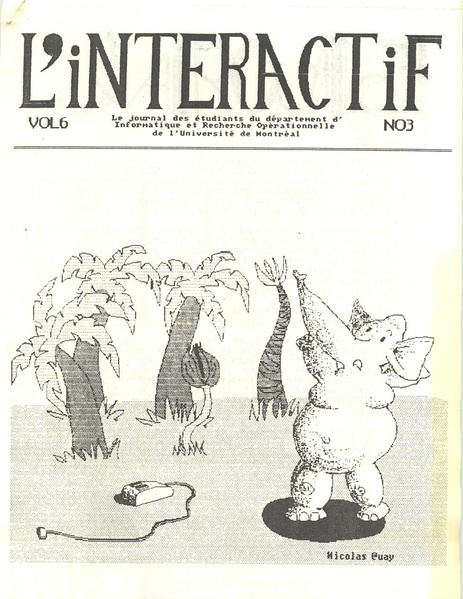Révision datée du 7 novembre 2025 à 22:58 par MattéoDelabre (discussion | contributions) (L’Interactif, le journal des étudiants du département d’informatique et recherche opérationnelle, volume 6, numéro 3, novembre 1987)