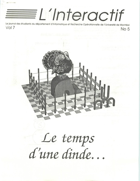 Révision datée du 7 novembre 2025 à 23:10 par MattéoDelabre (discussion | contributions) (L’Interactif, le journal des étudiants du département d’informatique et recherche opérationnelle, volume 7, numéro 5, janvier 1989)