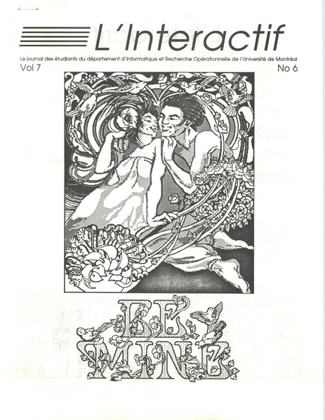 Révision datée du 7 novembre 2025 à 23:10 par MattéoDelabre (discussion | contributions) (L’Interactif, le journal des étudiants du département d’informatique et recherche opérationnelle, volume 7, numéro 6, février 1989)