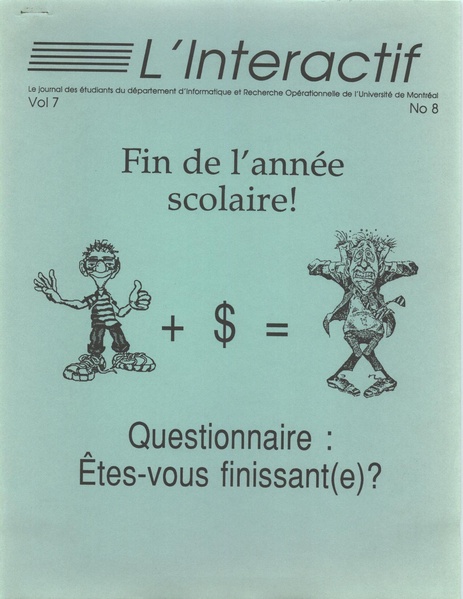 Révision datée du 7 novembre 2025 à 23:11 par MattéoDelabre (discussion | contributions) (L’Interactif, le journal des étudiants du département d’informatique et recherche opérationnelle, volume 7, numéro 8, avril 1989)
