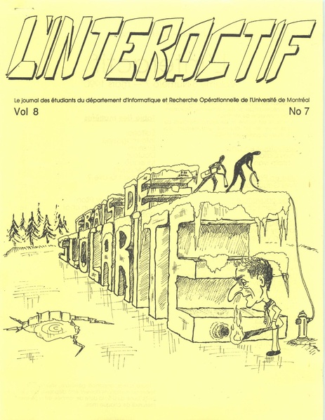 Révision datée du 28 novembre 2025 à 18:40 par MattéoDelabre (discussion | contributions) (L’Interactif, le journal des étudiants du département d’informatique et recherche opérationnelle, volume 8, numéro 7, mars 1990)