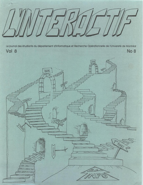 Révision datée du 28 novembre 2025 à 18:40 par MattéoDelabre (discussion | contributions) (L’Interactif, le journal des étudiants du département d’informatique et recherche opérationnelle, volume 8, numéro 8, avril 1990)