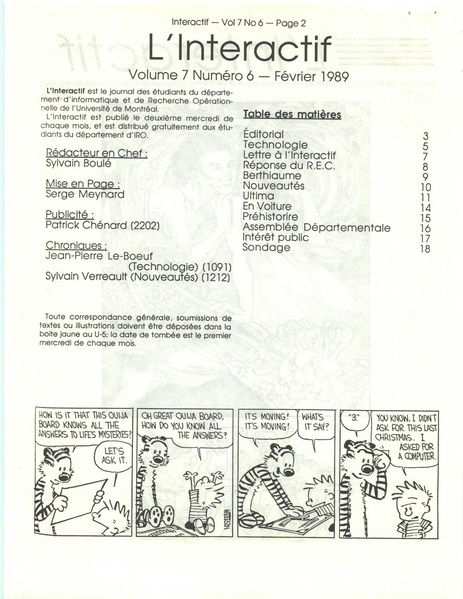L’Interactif, le journal des étudiants du département d’informatique et recherche opérationnelle, volume 7, numéro 6, février 1989