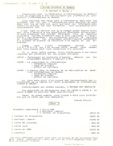L’Interactif, le journal des étudiant(e)s en informatique et recherche opérationnelle, volume 2, numéro 7, 23 janvier 1984