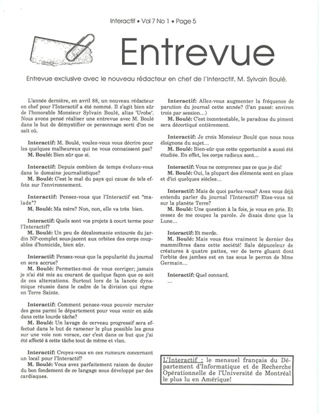 L’Interactif, le journal des étudiants du département d’informatique et recherche opérationnelle, volume 7, numéro 1, septembre 1988