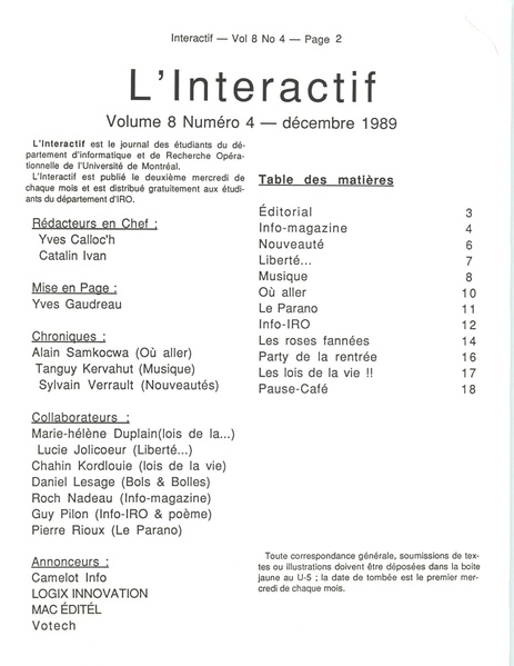 L’Interactif, le journal des étudiants du département d’informatique et recherche opérationnelle, volume 8, numéro 4, décembre 1989
